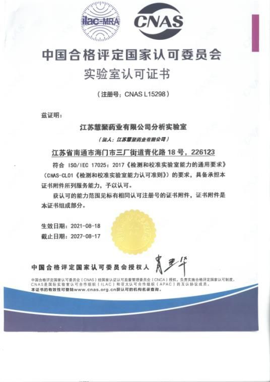 2021年8月18日,江蘇慧聚藥業(yè)有限公司通過審核,取得CNAS認證證書。此次獲得CNAS審核,既是對分析實驗室的技術實力及體系管理實力的認可,也是慧聚藥業(yè)建設國際一流實驗室道路上的關鍵一步。面向未來,分析實驗室將繼續(xù)秉承“數(shù)據(jù)準確、運轉(zhuǎn)高效、行為公正、態(tài)度嚴謹”的質(zhì)量方針,嚴格按照法規(guī)要求、體系要求、國際標準、國內(nèi)標準認真控制各檢測環(huán)節(jié),發(fā)揮各職能部門功能,完成各項檢測任務,以專業(yè)的技術支持,確保檢測報告的準確及時,持續(xù)提升客戶滿意度。